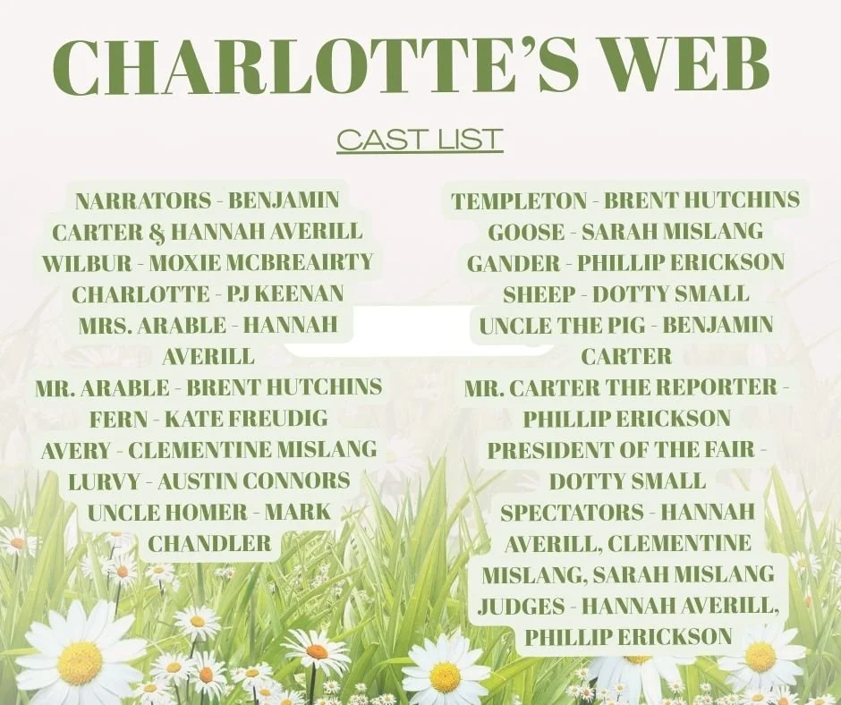 Announcing the cast for Charlotte’s Web! Performances Friday, May 1st at 6:00 PM and Saturday, May 2nd at 1:00 PM